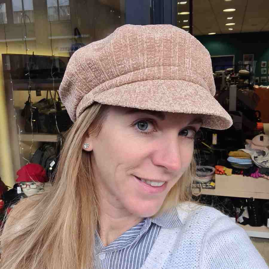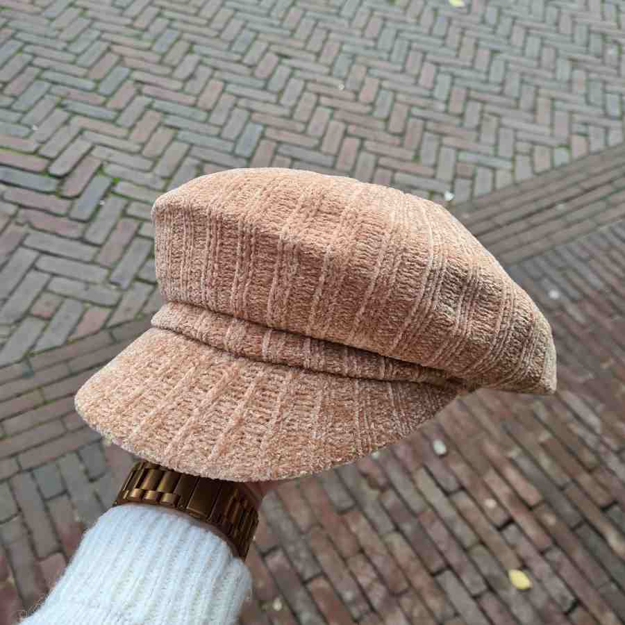 Petje beige gemêleerd dames met stroken van polyester met leuke klep (past altijd!)