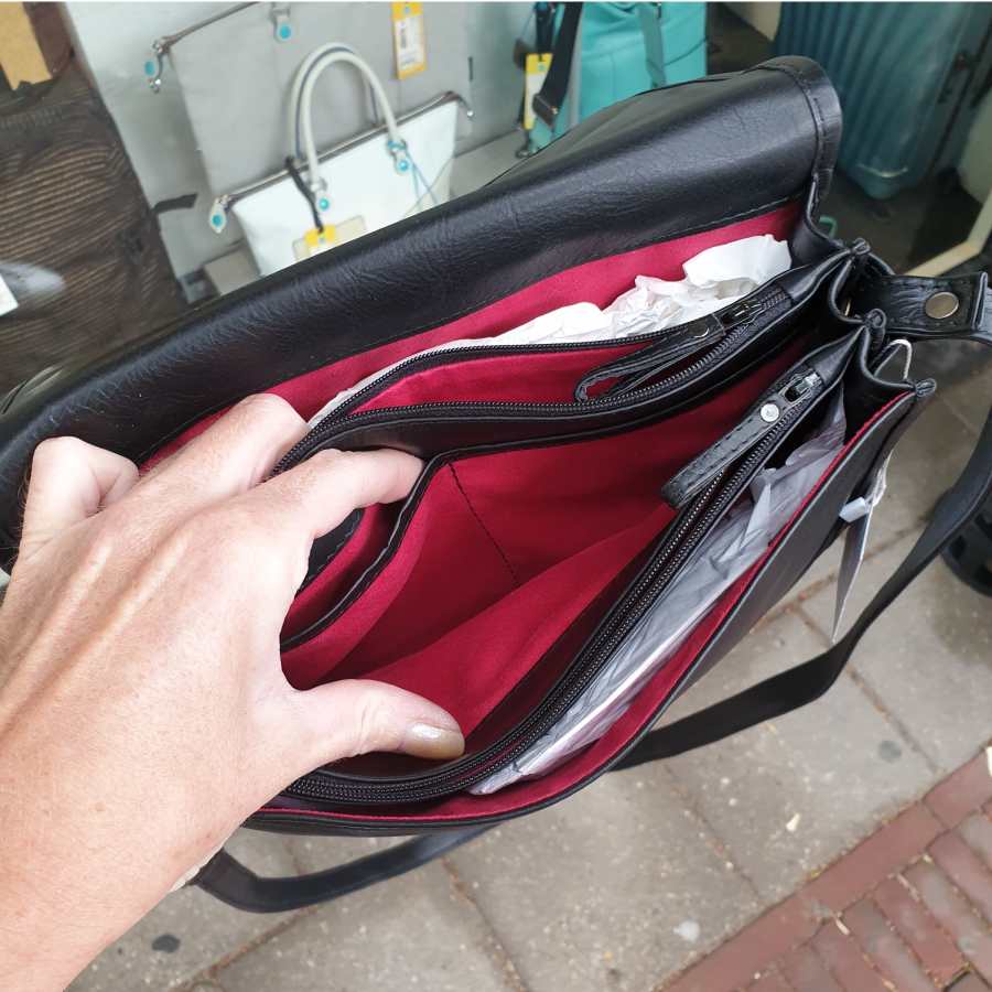 Superzachte leren Berba schoudertas met heel veel vakjes (stewardessetas) en rode voering