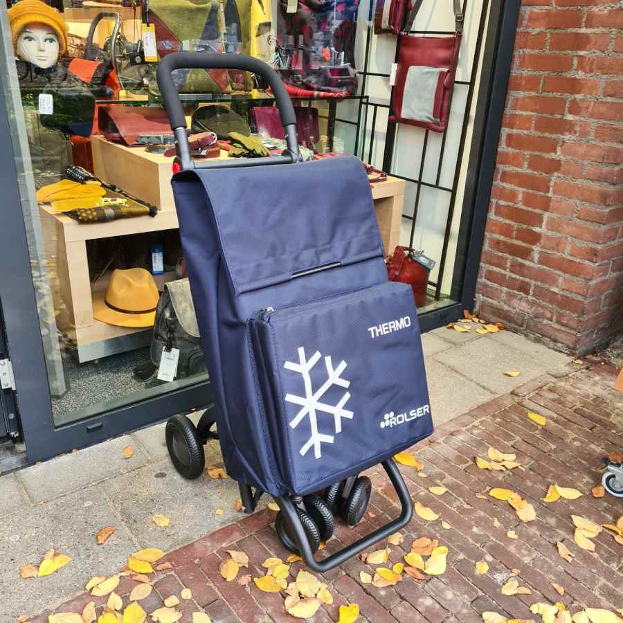 Opvouwbare ROLSER boodschappentrolley met vier wielen en koelvak in donkerblauw