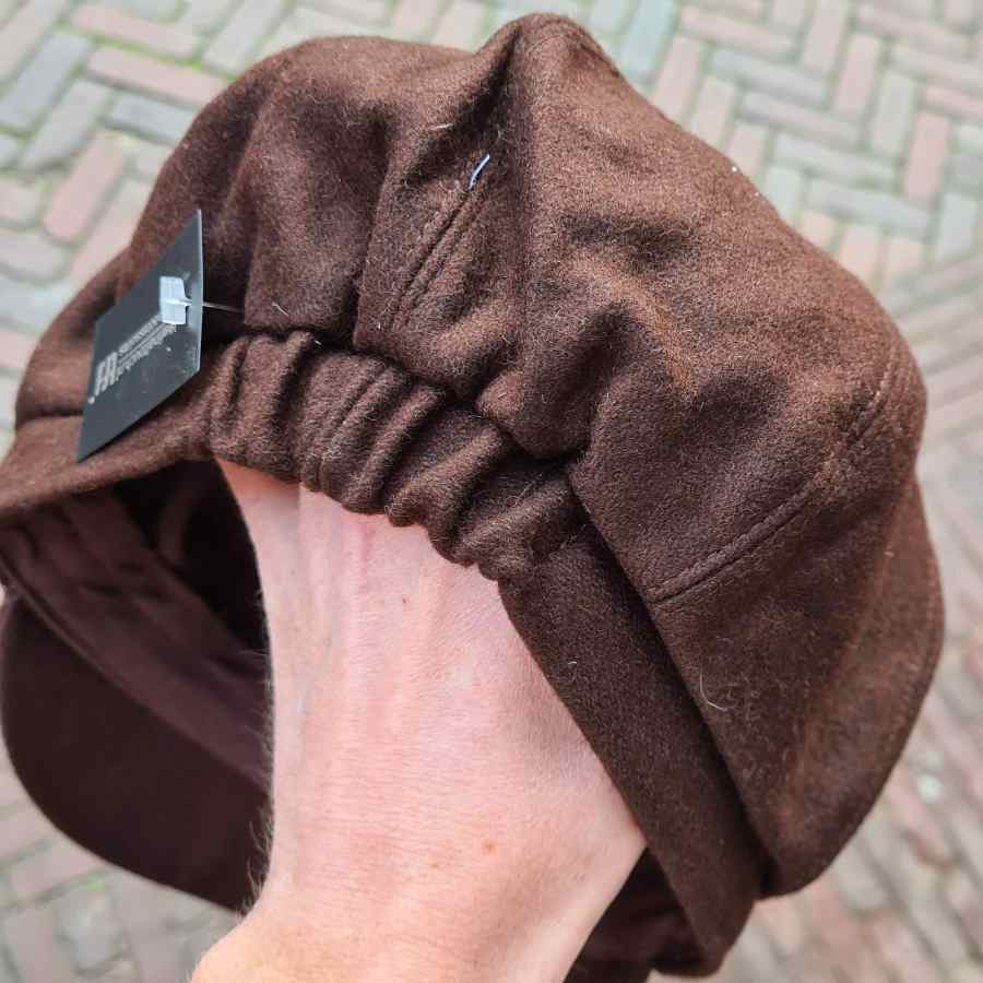 Wollen petje met klepje en elastiek aan de achterkant in een donkerbruine kleur
