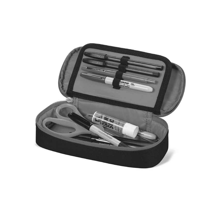 Stevige pennenetui met tussenvak en harde buitenkant. Deze ovale etui heeft een rits rondom en een tussenvak waar je 4 pennen in vast kun maken met het elastiek. Aan de achterkant van het tussenschot zit een handig ritsvak waar je losse spullen in kunt bewaren. Bescherm je rugzak door alle scherpe dingen in je etui te bewaren. Ideaal voor een geodriehoek en een passer. Veel etui’s hebben dezelfde print als de tassen, zodat je een combinatie van rugzak met schooletui kunt maken. Laat ons weten wat je zoekt of kom gezellig langs in onze winkel in Delft als je hier niet vindt wat je zoekt.