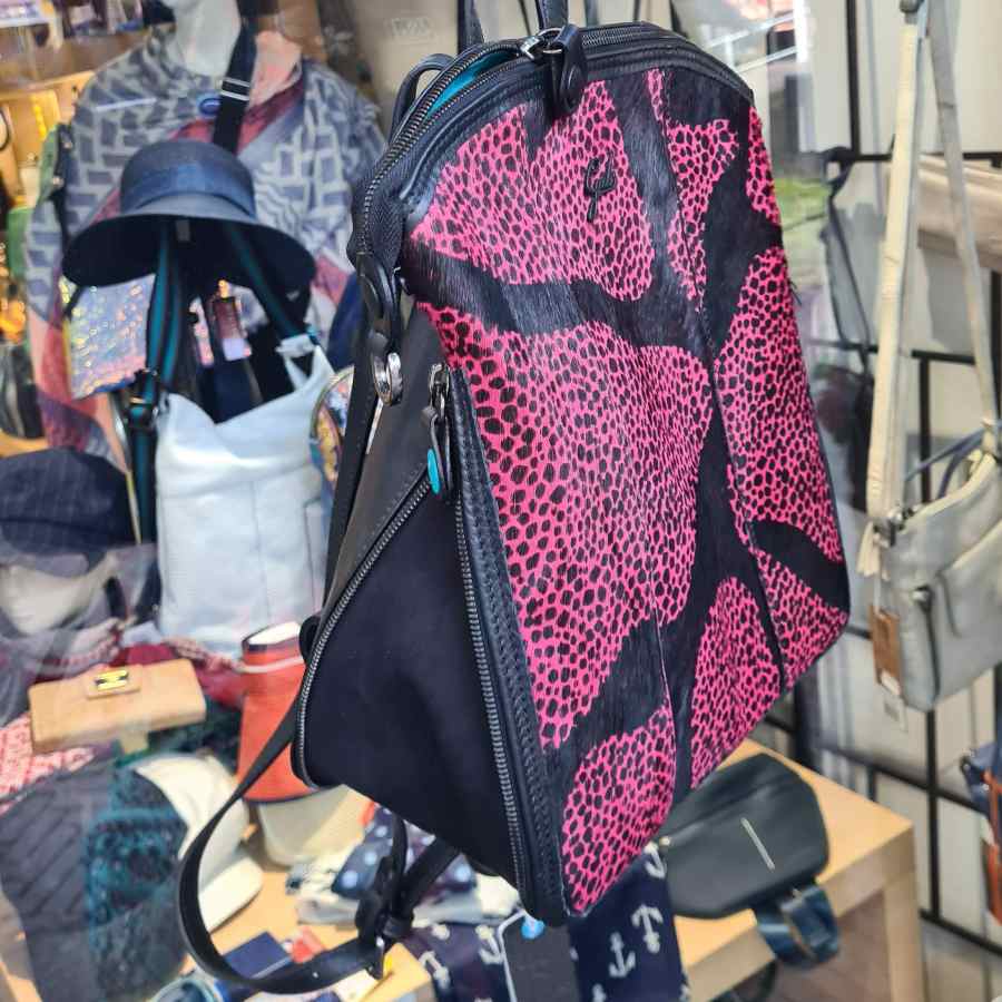 Gabs Luigia Small rugtas met een voorkant van roze vacht met zwarte stippen en een zwart leren achterkant. De Luigia van Gabs is gemaakt van zacht kalfsleer uit Italië. Deze handige rugtas heeft een rits aan de onderkant om de tas groter te maken.