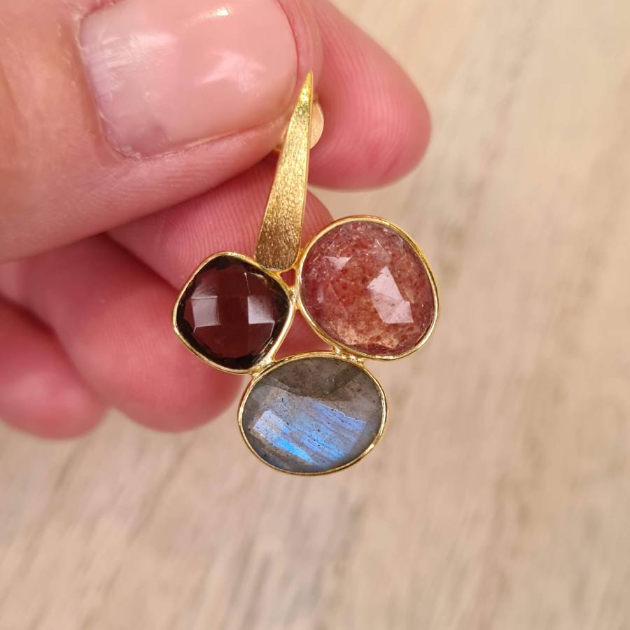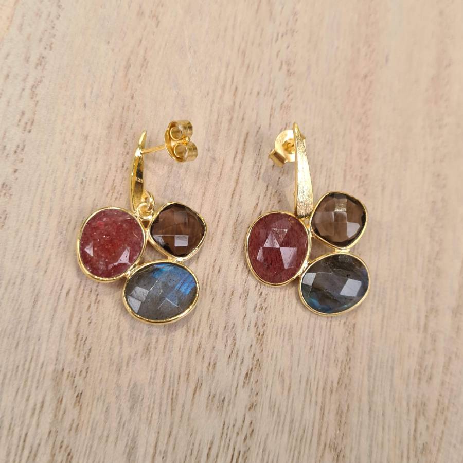 Prachtige oorbellen van 18K verguld zilver met echte stenen. De drie stenen zijn: Labradoriet, Rookkwarts en Aarbeienkwarts. (in het engels: Labradorite, Smoky Quartz and Strawberry Quartz). De oorstekers zitten mooi op het oor zodat je niet merkt dat je ze draagt. De echte stenen zijn prachtig van kleur en echt een luxe sieraad.