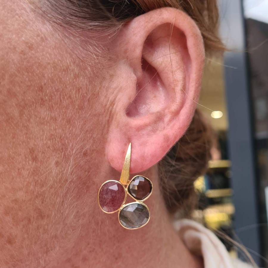 Oorsteker met labradoriet, rookkwarts en aarbeienkwarts in 18K verguld zilver