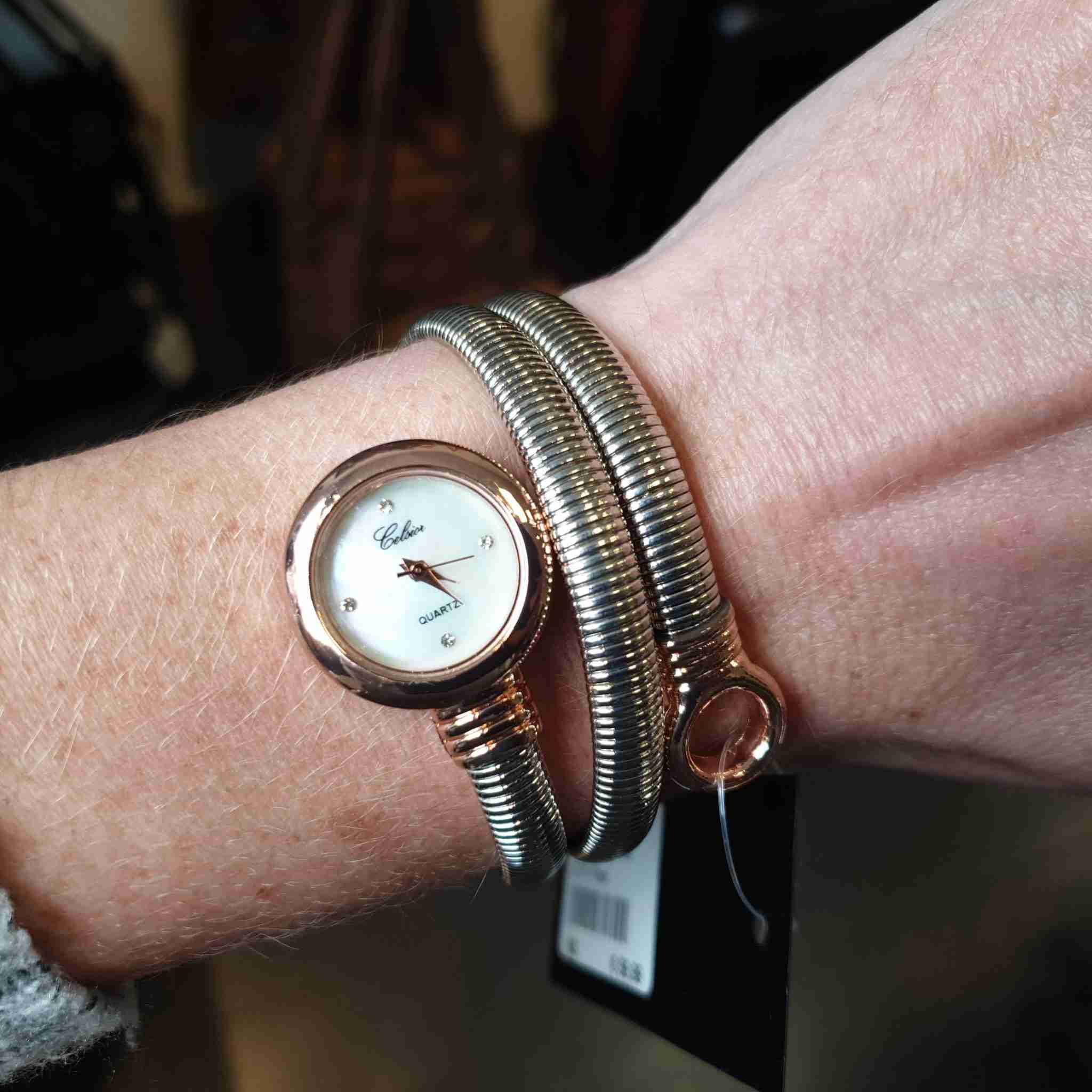 Supergaaf horloge met flexibele stalen band die je om je pols heen wikkelt. Hierdoor past dit horloge altijd en is supergemakkelijk om te doen. De achterkant van de klok is stainless steel en dus anti-allergisch. Verkrijgbaar in verschillende kleuren zolang voorradig. Stuur een berichtje als je meer foto’s wilt zien.
