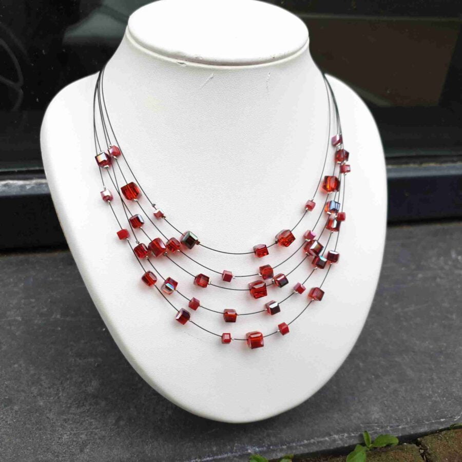 Mooie ketting van staaldraad met kleine blokjes in rood