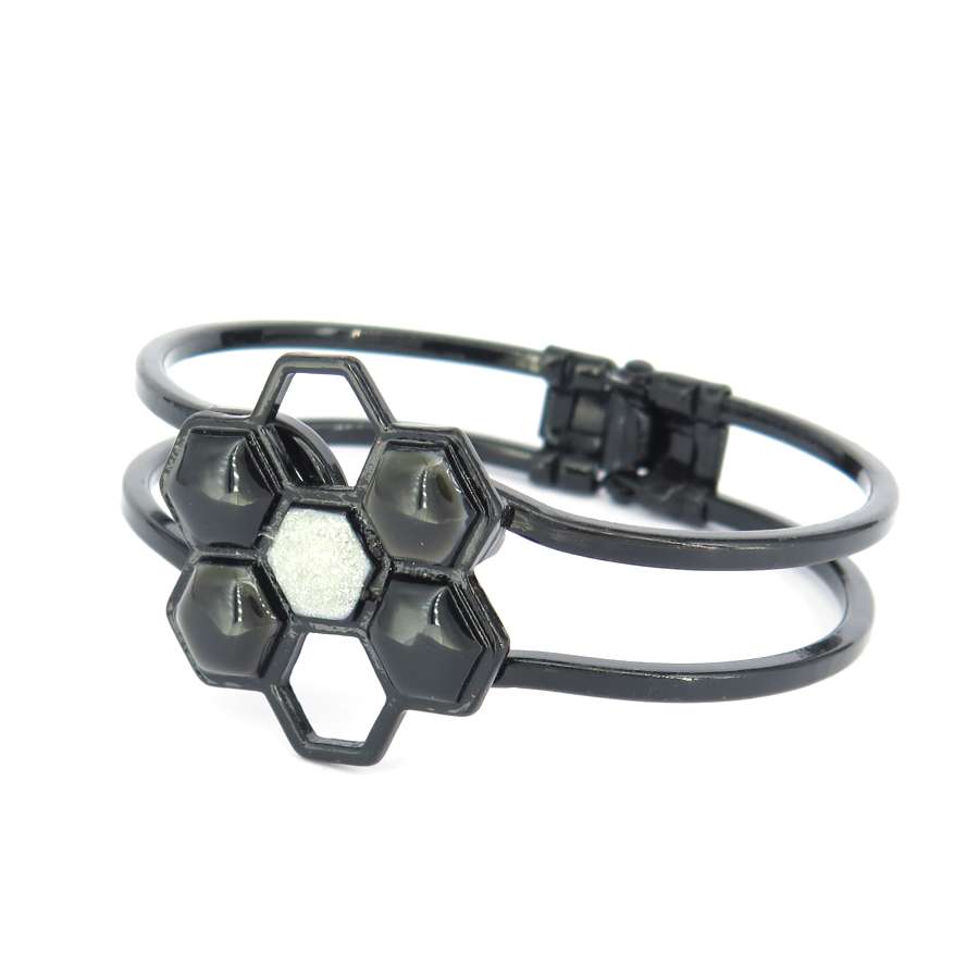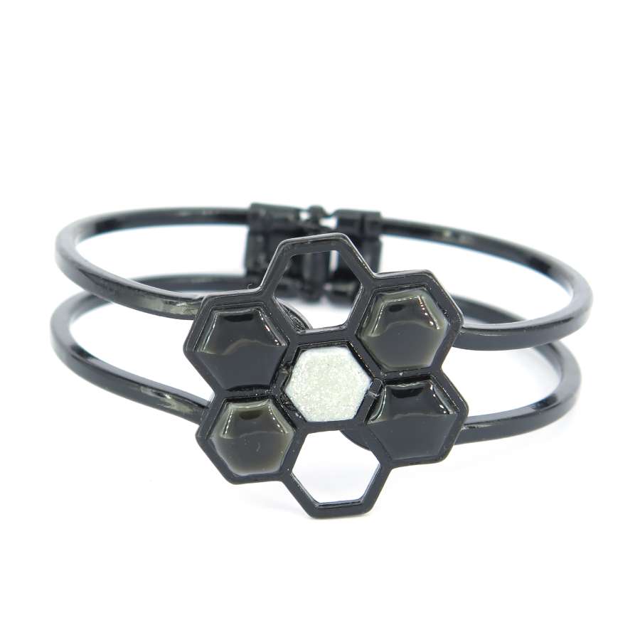 Zwarte klemarmband met leuke medaillon van verschillende zeshoeken. Door het klem systeem van deze armband is deze makkelijk om en af te doen. De zeshoekige voorkant is 3 x 3 cm groot. De armband past om een pols tussen de 16 en 20 cm breed.
