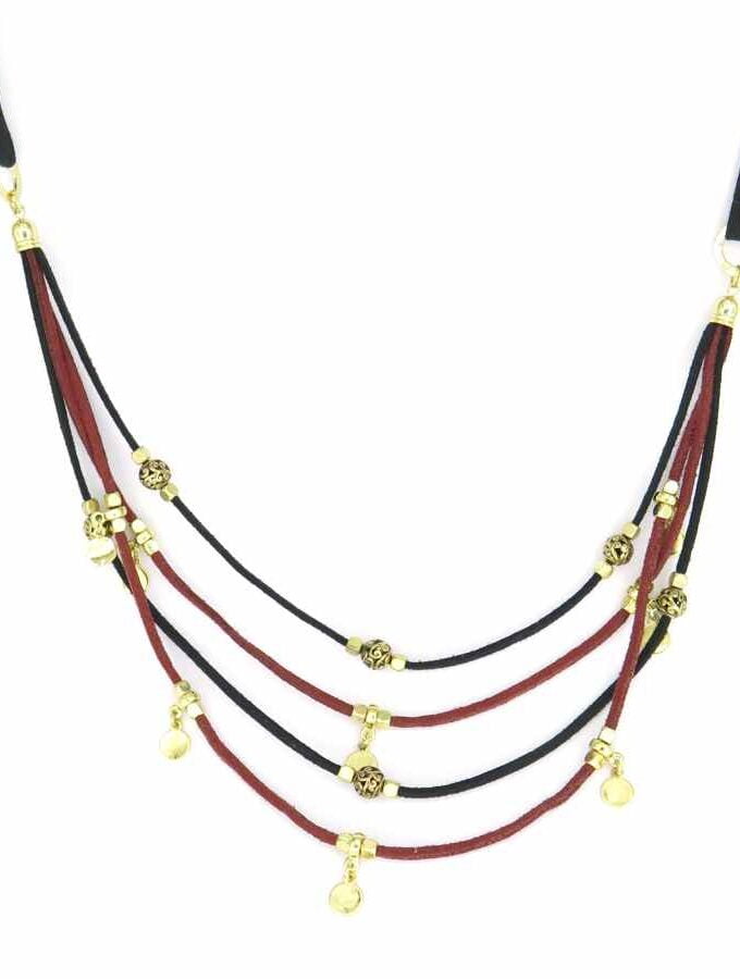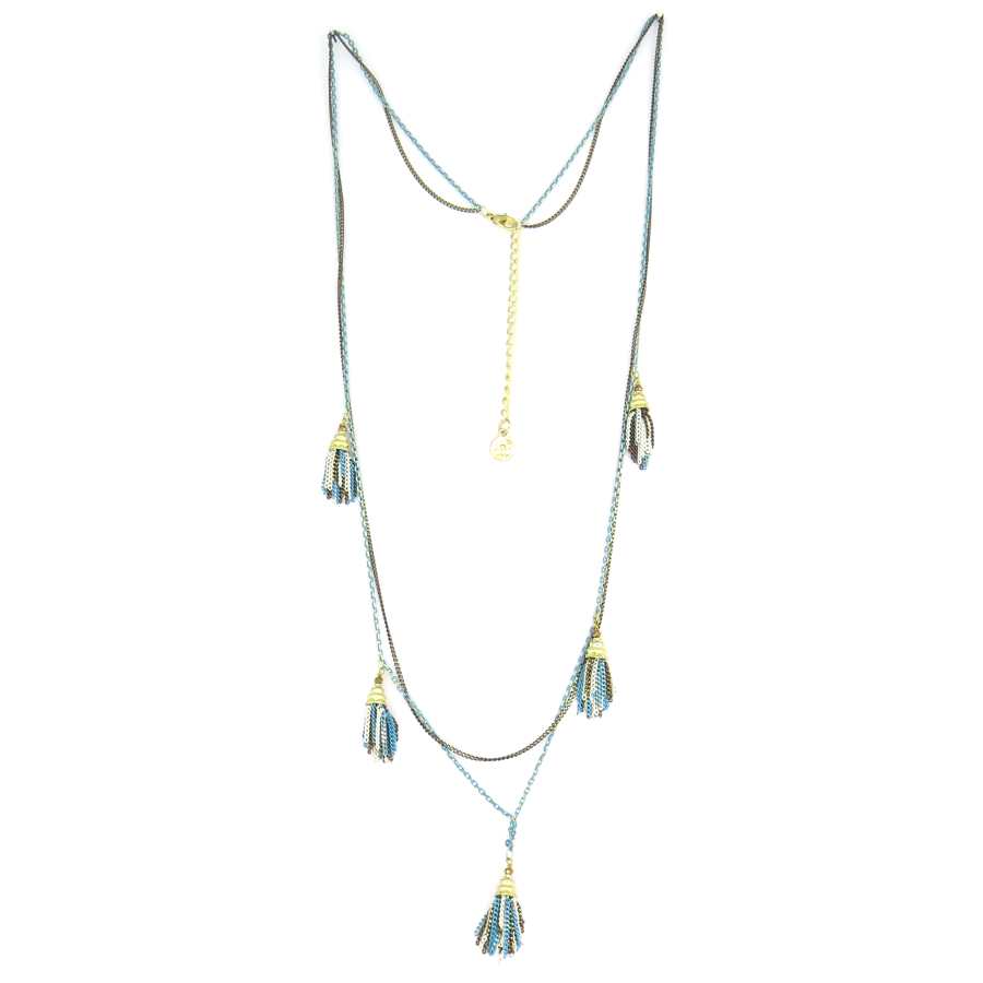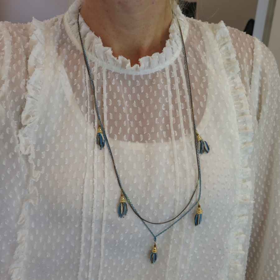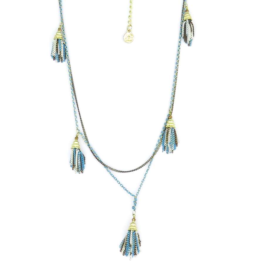 Dubbele lange ketting met bruin, wit en blauwe kwastjes