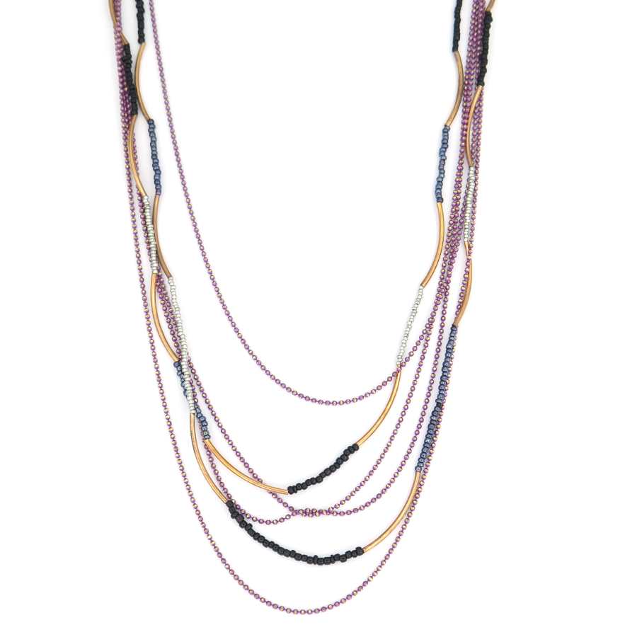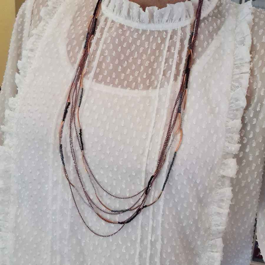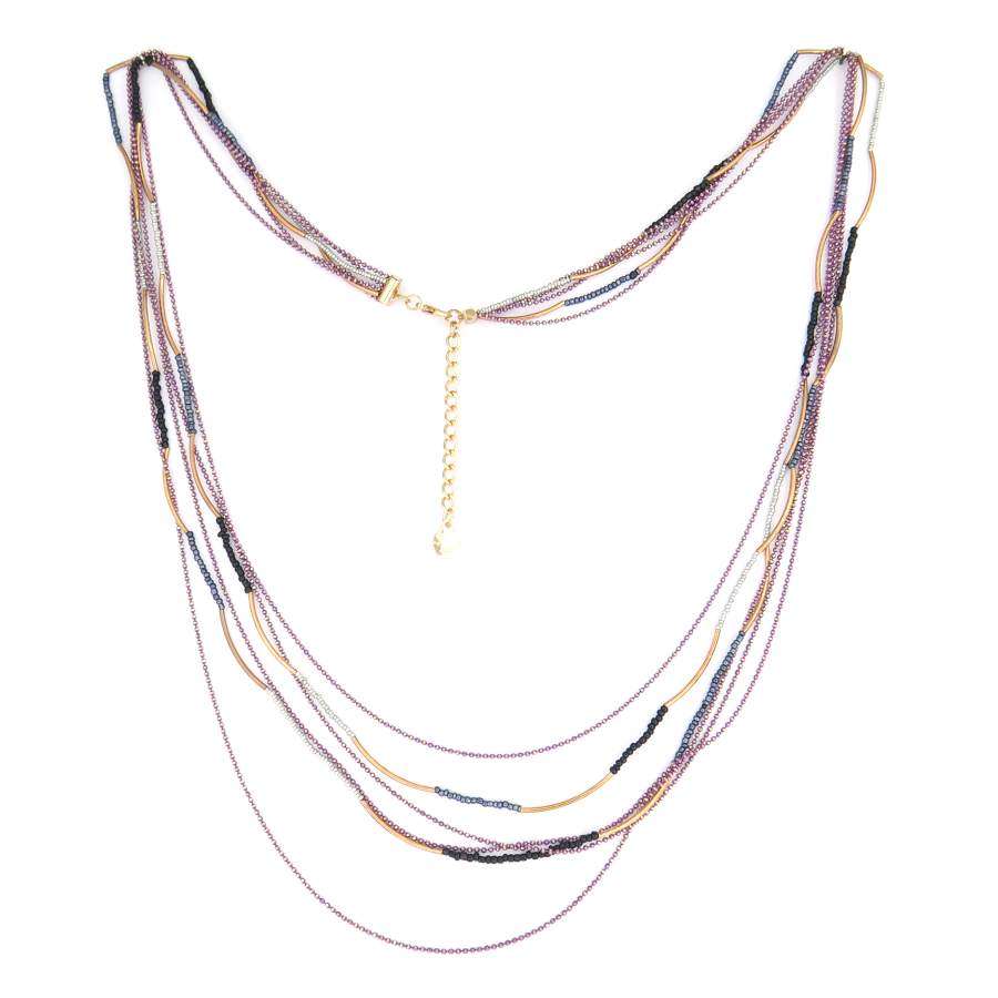 Lange ketting met verschillende strengen en kleine kraaltjes in rosé en paars. De ketting is 82 + 6 cm lang en goed te combineren met rosé kleurige sieraden.