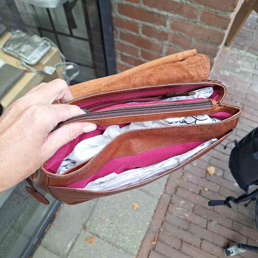 Leuke schoudertas met ronde onderkant en ronde klep. Achter de klep heeft deze leren tas een tussenvak met rits, een voorvak en een leuke gekleurde voering. De klep sluit met een magneet en ook op de klep zit een ritsvak. Aan de achterkant heeft deze ronde tas ook een ritsvak. De schouderband is gemakkelijk langer te maken. We hebben bij Stuivenga Lederwaren Delft een grote collectie leren tassen, dus neem een kijkje online, maar onze collectie in de winkel is nog groter.