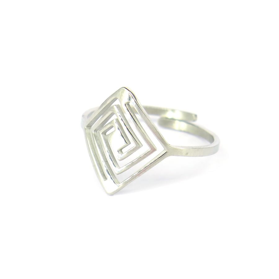 Leuke, kleine ring van stainless steel met opengewerkte vierkante voorkant. Aan de achterkant is deze zilverkleurige ring open, zodat je hem om elke vinger kunt dragen. Ook leuk om als mid ring te dragen, wat hoger op je vinger. Het vierkantje is 1.5 x 1.5 cm.