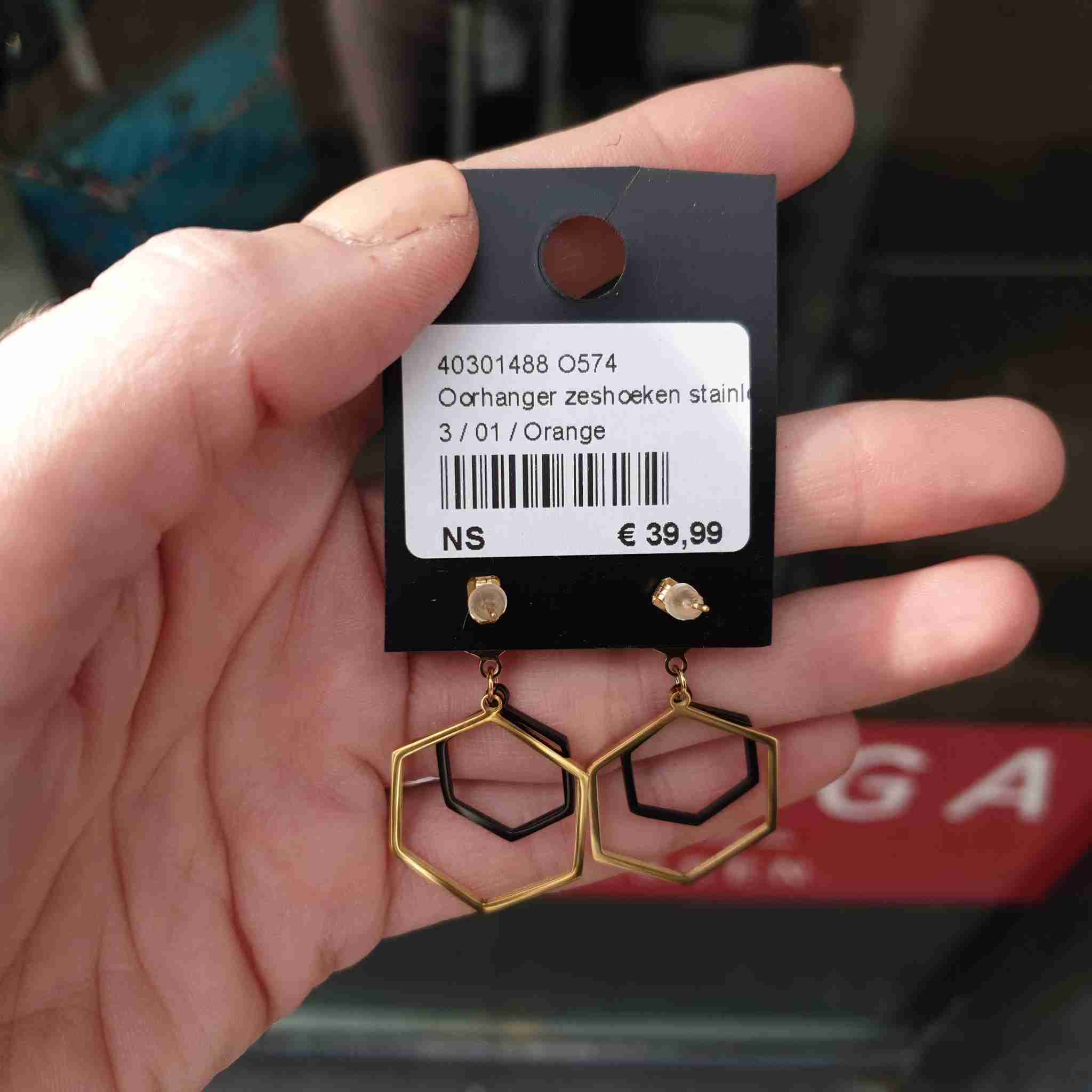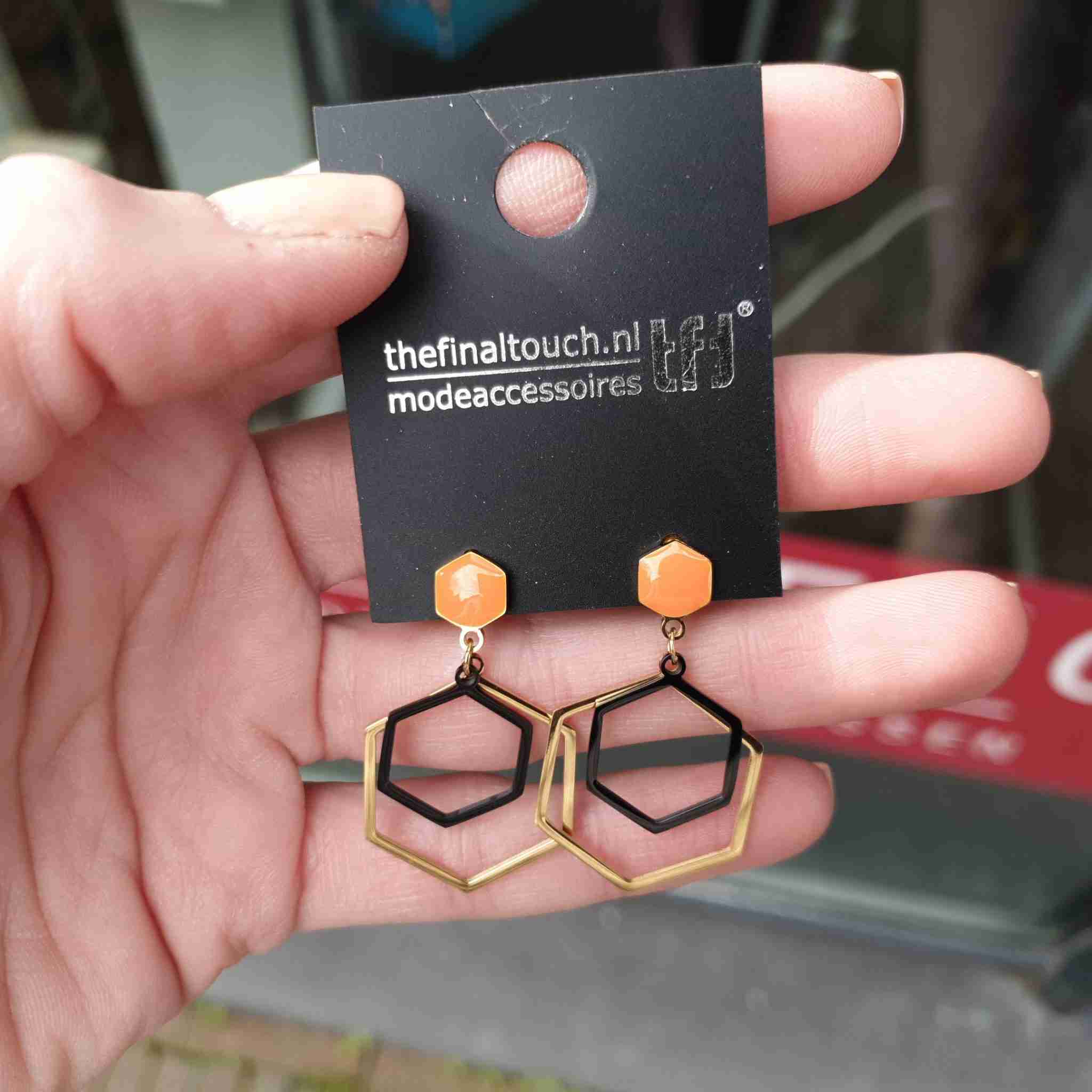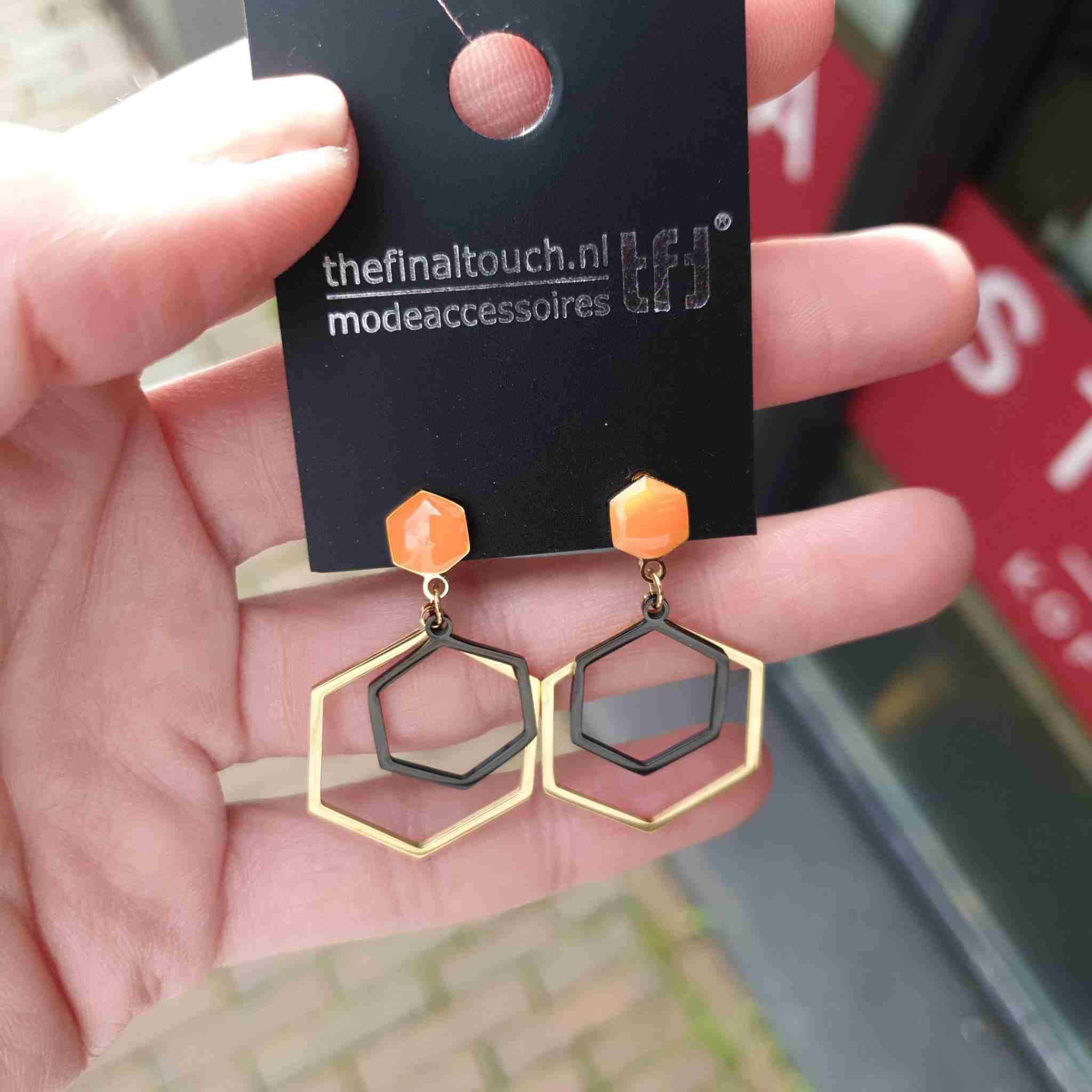 Leuke oorhanger met zeshoeken in goudkleur en oranje steen op je oorlel