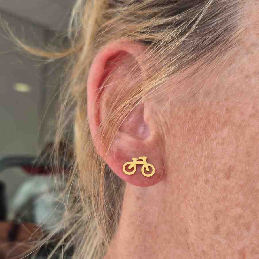 Oorbellen met fietsen in goudkleur gemaakt van stainles steel. Dit materiaal is anti allergisch en verkleurd niet. Daarom kun je deze oorbellen met een fiets gewoon inhouden en kunnen ze ook nat worden.