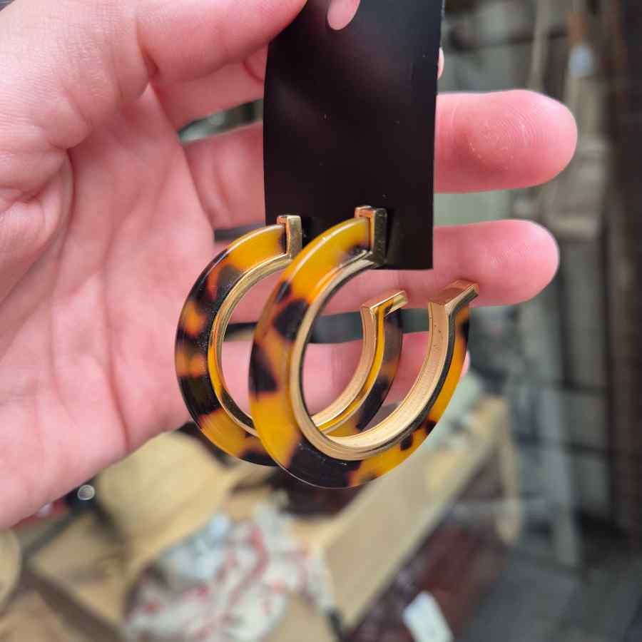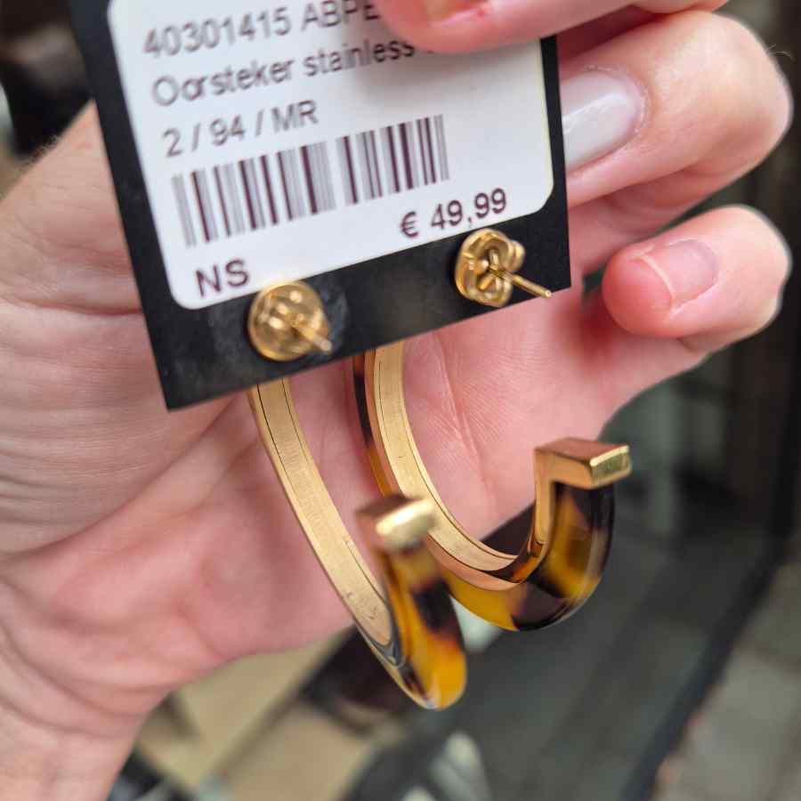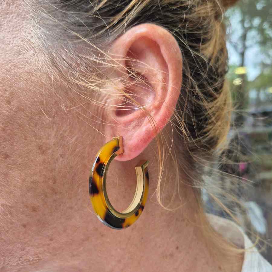 Ronde oorhangers in goudkleur stainless steel en emaille in bruin met beige. Stainless steel is anti-allergisch en zal niet verkleuren.De diameter is 4,5 cm en de oorbel zelf is 1cm breed.