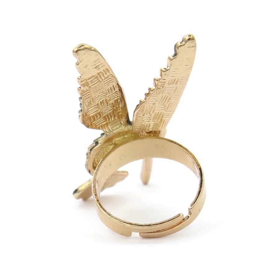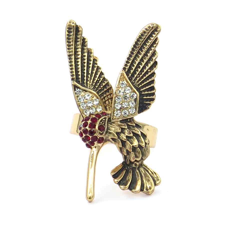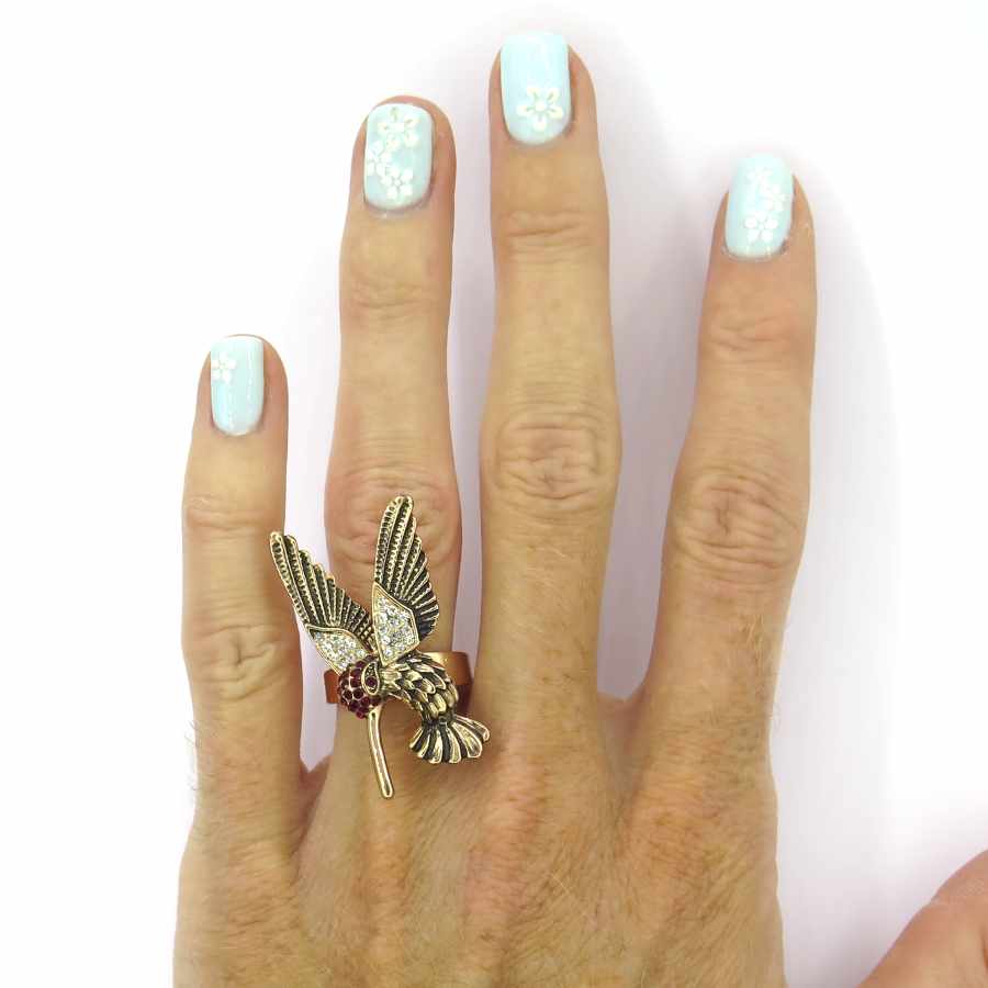 Ring met kolibrie vogel met mooie subtiele steentjes in wit en rood. De ring zelf is rosé van kleur en aan de achterkant te verstellen. De kolibrie is 3.7 cm lang en 1.8 cm breed.