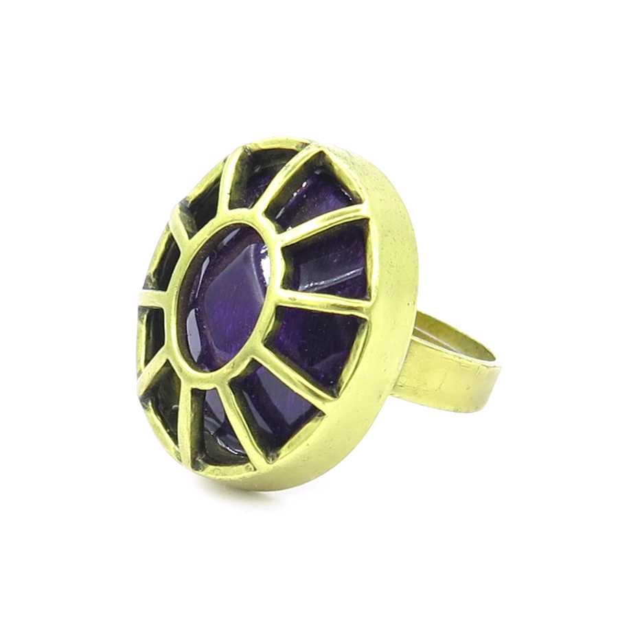 Ring goudkleur met medaillon in paars met kunststof steen die je aan de achterkant kunt verstellen. De medaillon is 2.5 x 2 cm groot.