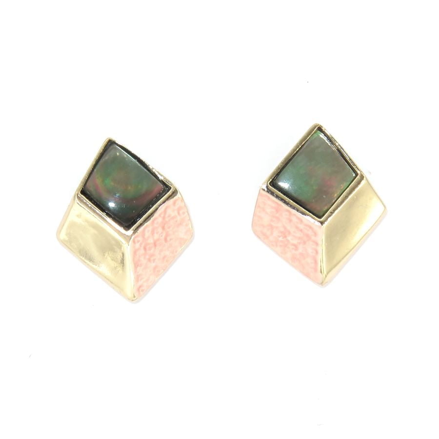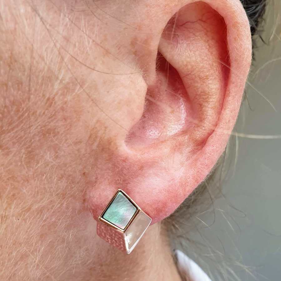 Vierkante oorstekers met drie verschillende vlakken. Deze oorbellen lijken zo uit een Escher schilderij te komen. Een vlak is parelmoer, een vlak is mat roze en een vlak is glimmend roze. Deze oorbellen passen mooi op je oorlel en passen uitstekend bij andere rosé sieraden.