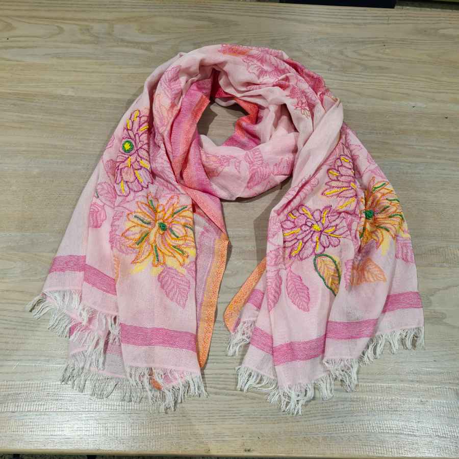 Roze sjaal met mooie geborduurde bloemen. Deze sjaal is gemaakt van katoen en draagt hierdoor erg comfortabel. Deze sjaal kun je ook als omslagdoek gebruiken.