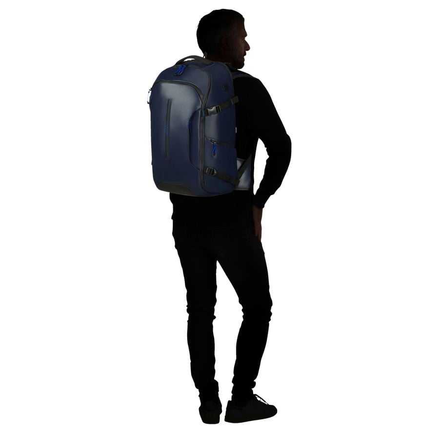 Medium maat rugtas (38 liter) voor op de reis van de Ecodiver serie met apart laptopvak en heupbanden in donkerblauw
