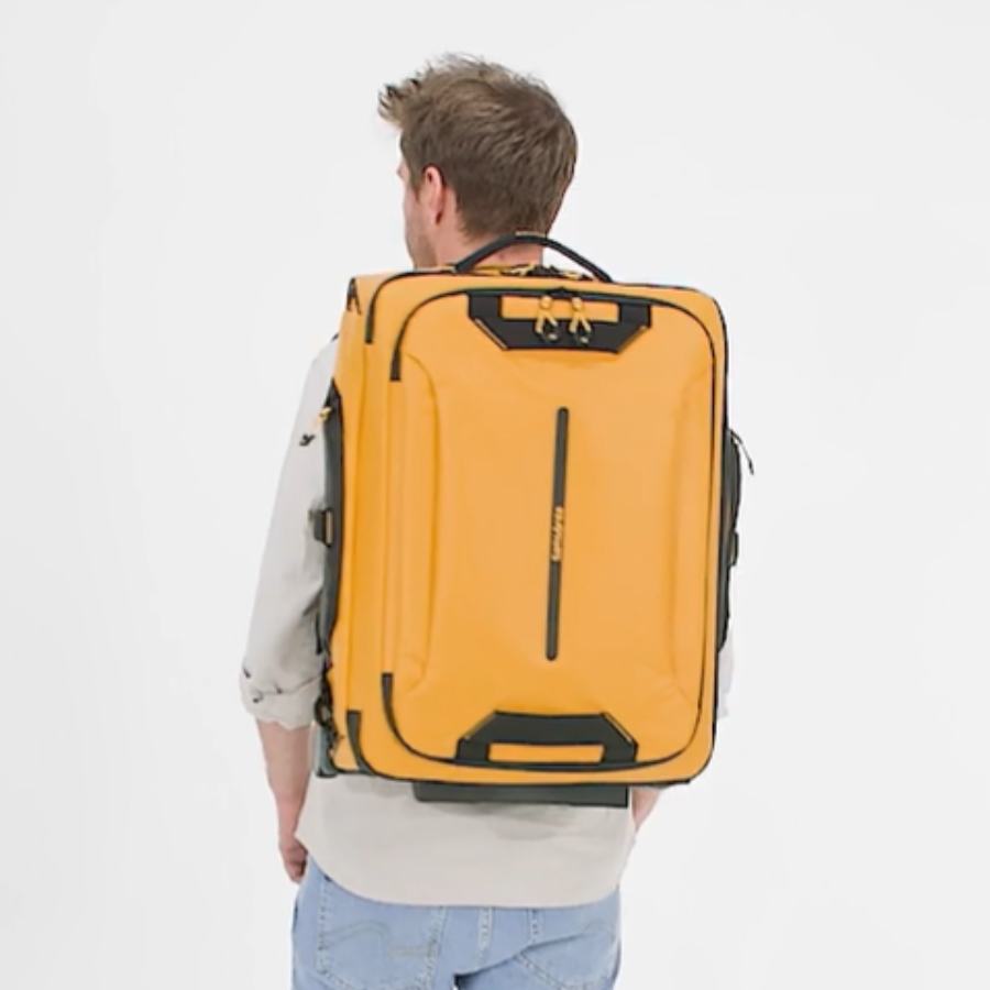 Handbagage rugzak van Samsonite Ecodiver in geel met rugbanden die je in het achtervak kunt opbergen met een inhoud van 51 liter
