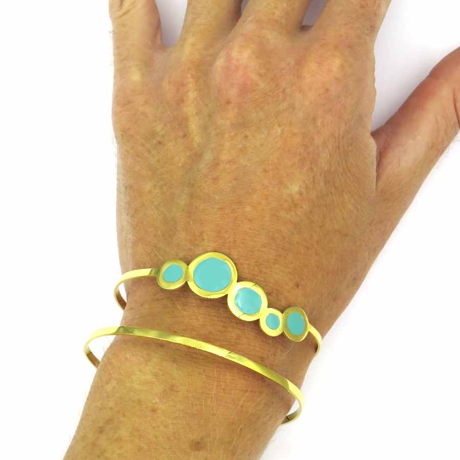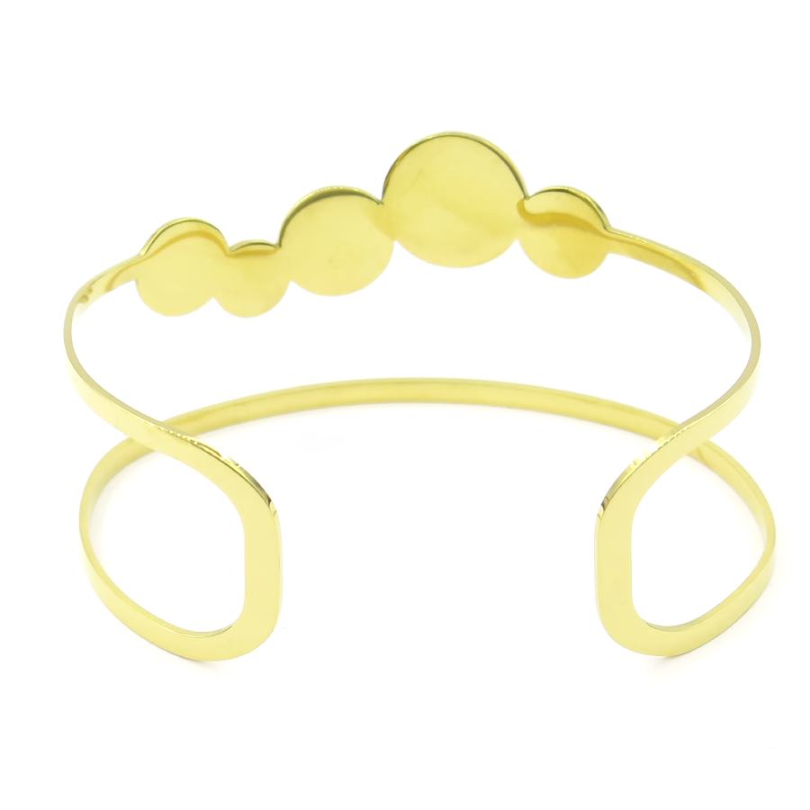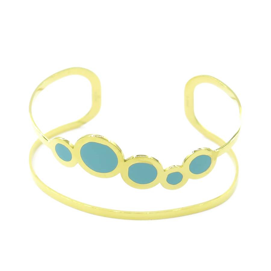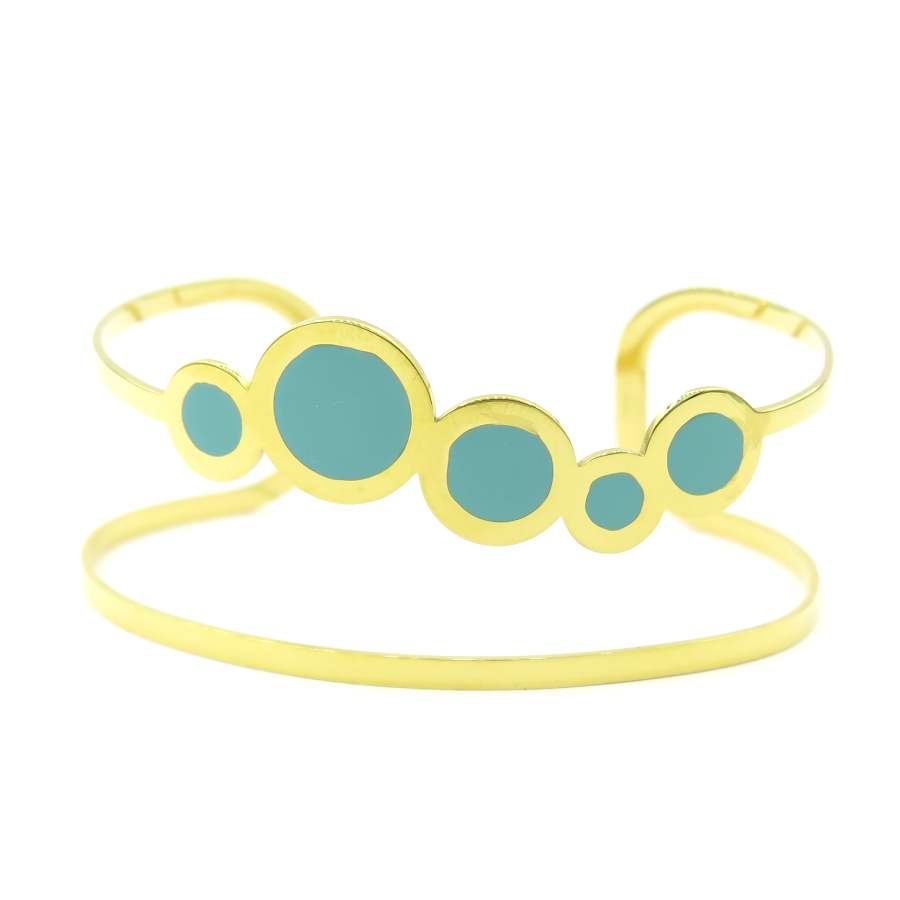 Modische armband in goudkleurig stainless steel en groen/blauwe cirkels. Deze armband past altijd want je kunt hem makkelijk aanklemmen. Deze armband is totaal 3 cm breed.