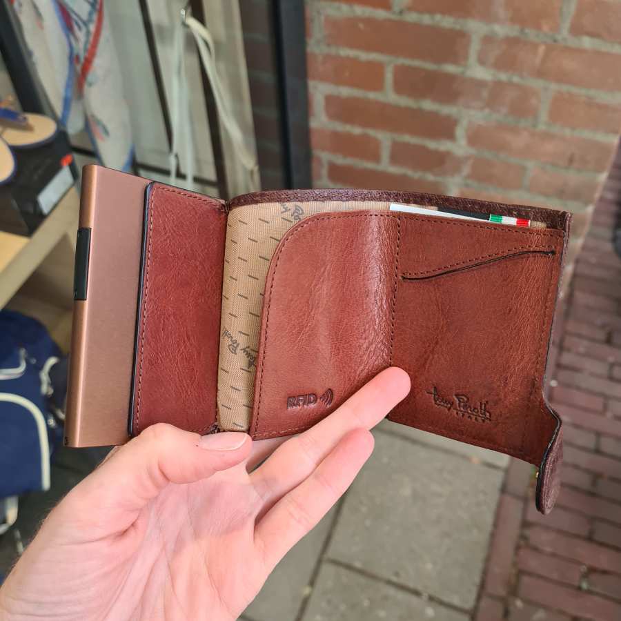 Superhandig en erg mooi, dat zijn de kleine portemonnees van het Italiaanse merk Tony Perotti. Deze Cardholder beschermd je kaarten tegen het uitlezen van de chip zodat ze je niet kunnen skimmen. Dit handige model heeft in de cardprotector ruimte voor 6 pasjes die je gemakkelijk omhoog duwt. In de flap die je afsluit met een drukker is ruimte voor meer pasjes, briefgeld en bonnetjes. Ook dit deel van de portemonnee is beschermd met RFID en beschermd dus je kaarten.