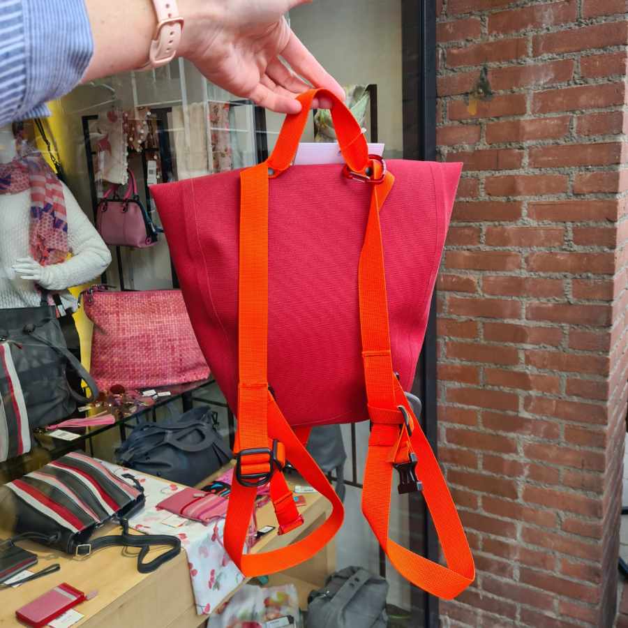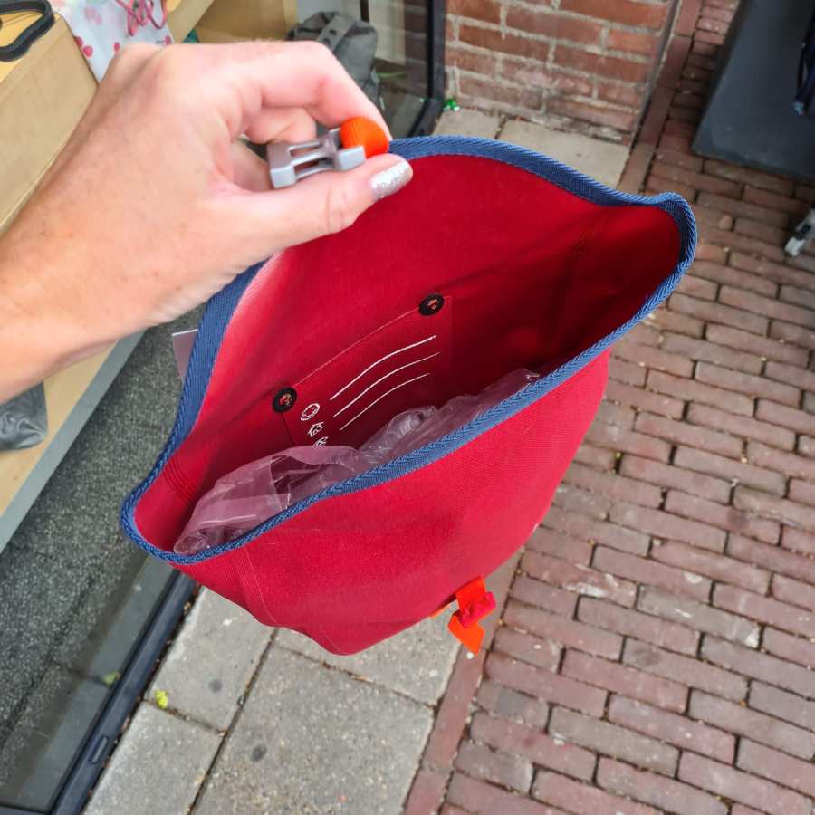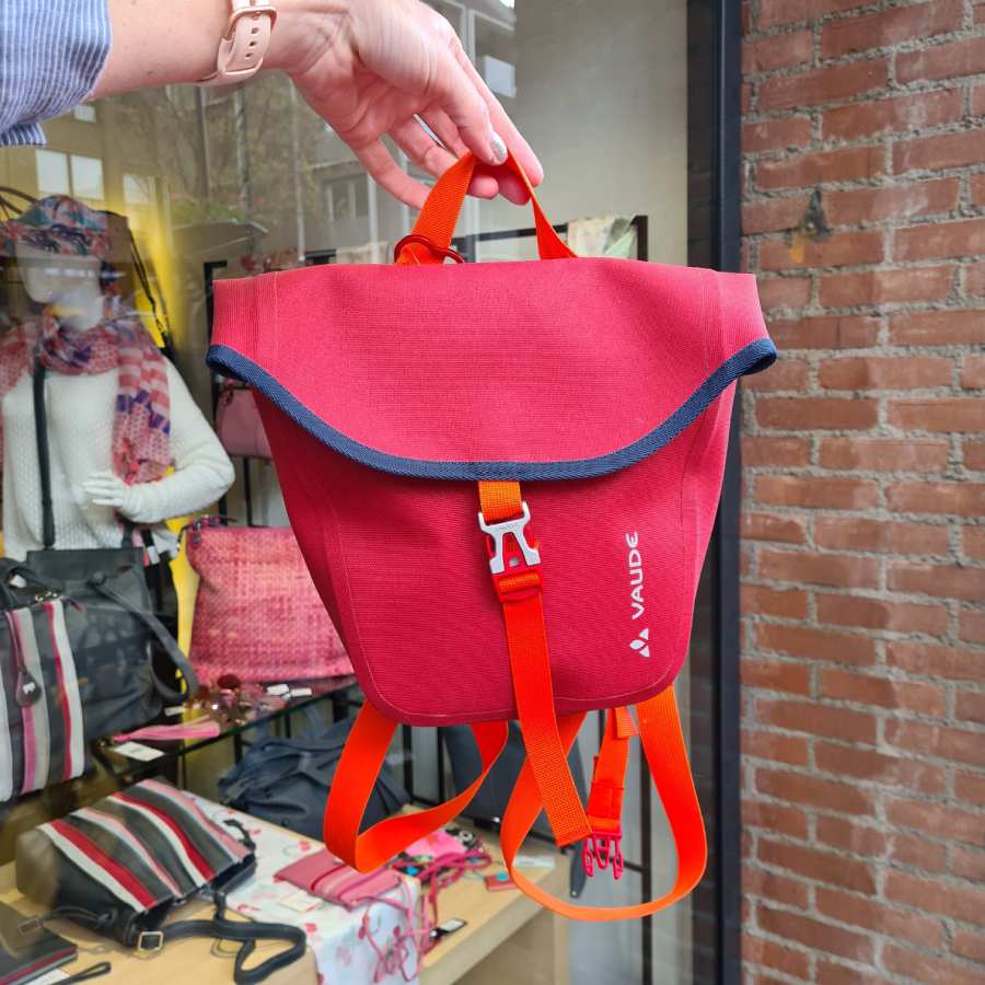 Kleine rugtas voor kinderen van waterdicht materiaal van Vaude in rood met blauwe rand