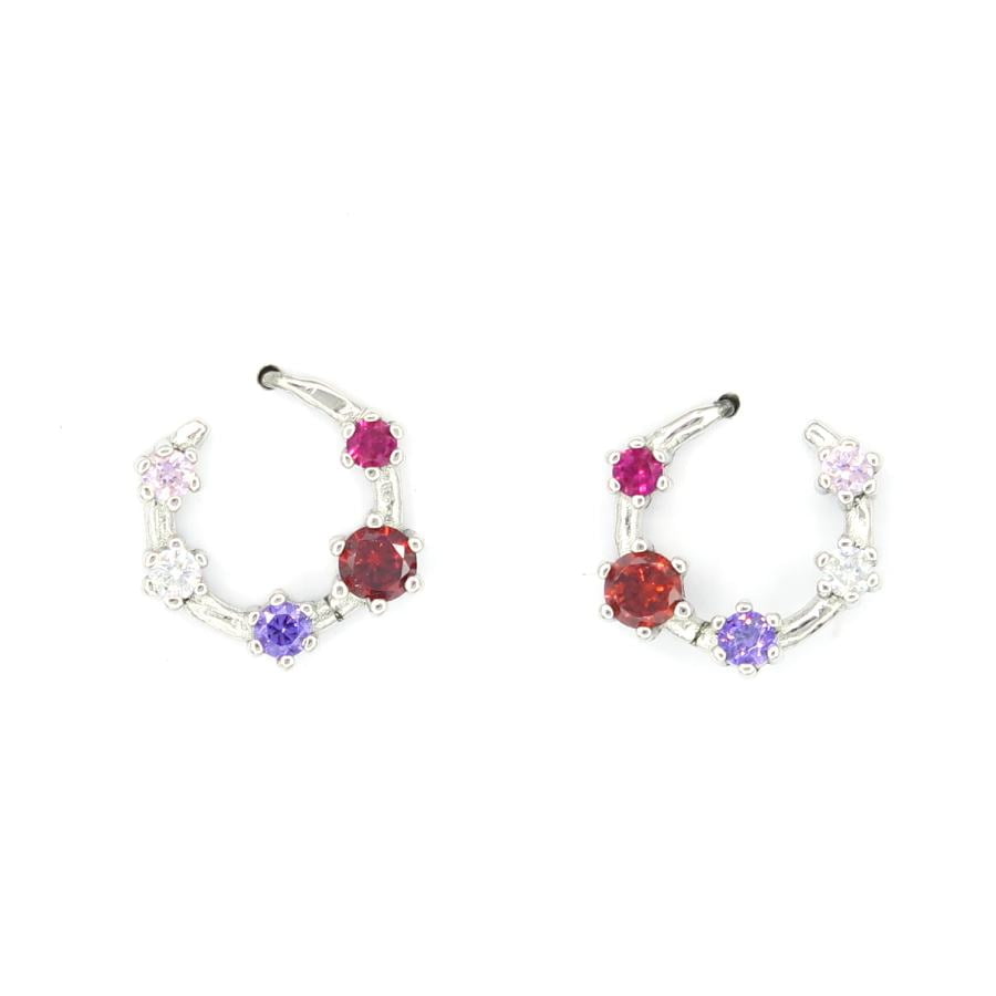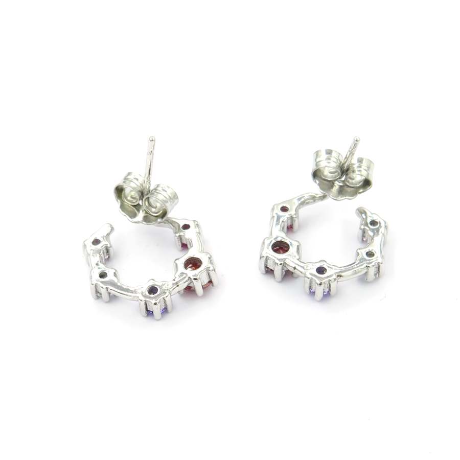 Echte zilveren oorbellen met kleine steentjes in rood en roze. De oorbel valt mooi plat op het oor en heeft een diameter van 1.2 cm en de steentjes hebben verschillende groottes.