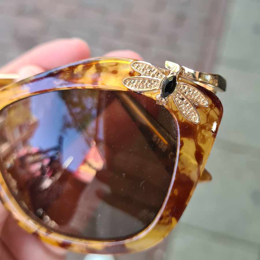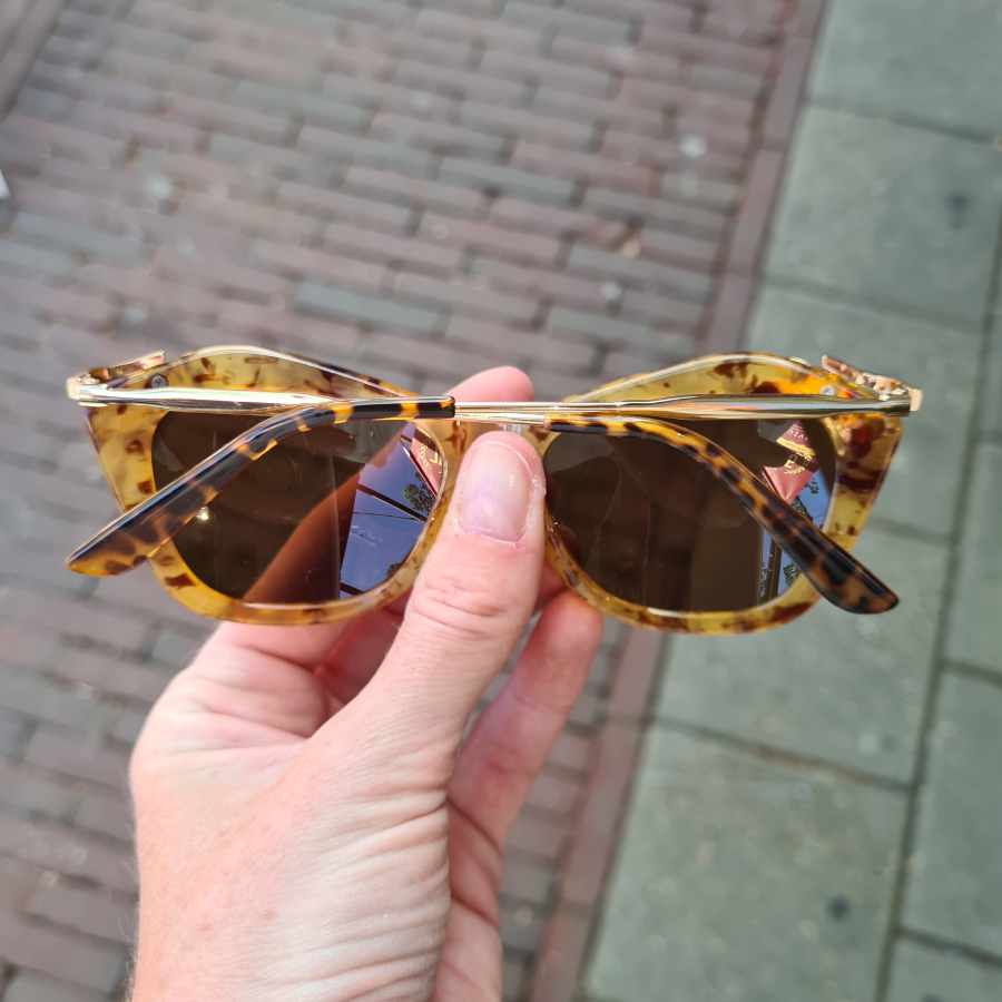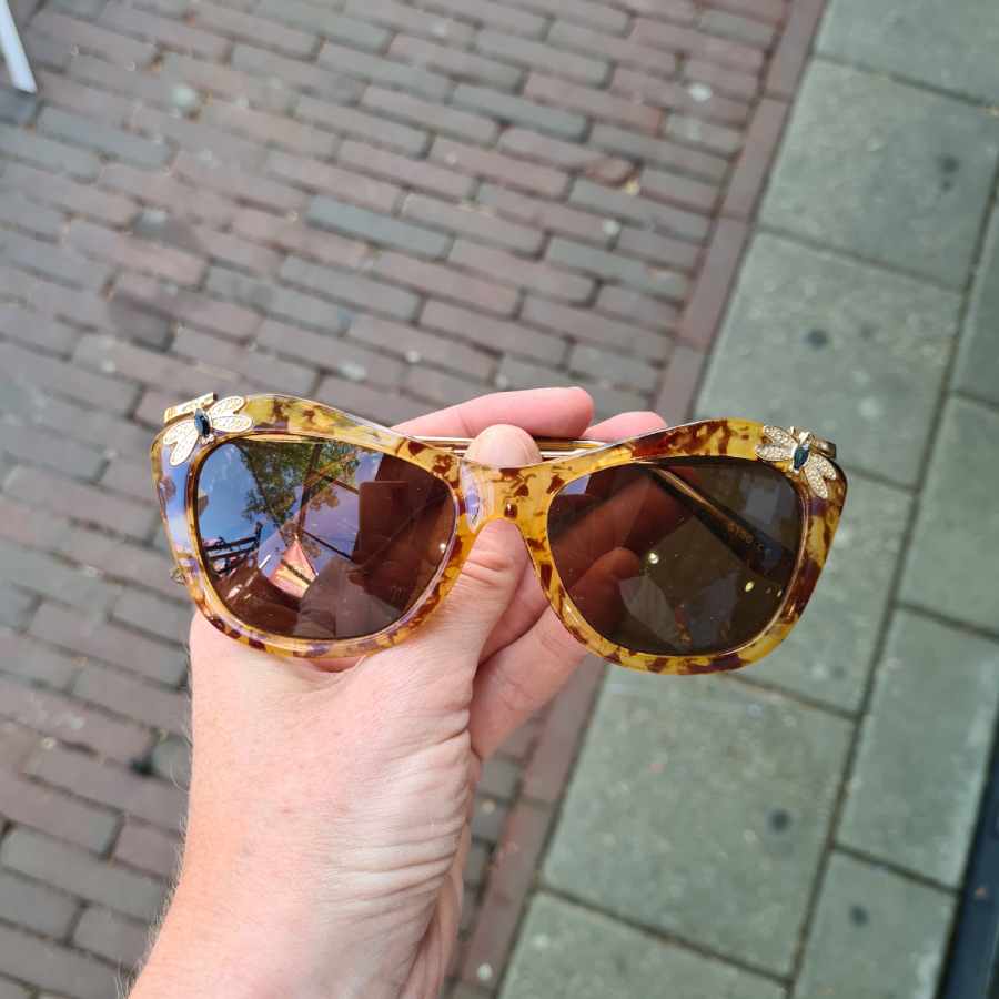 Beige gevlekte zonnebril met bruine glazen en smalle pootjes met vlinders