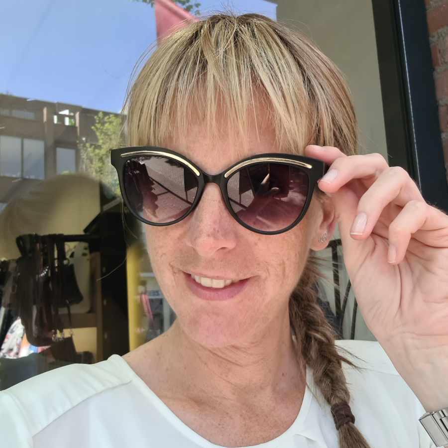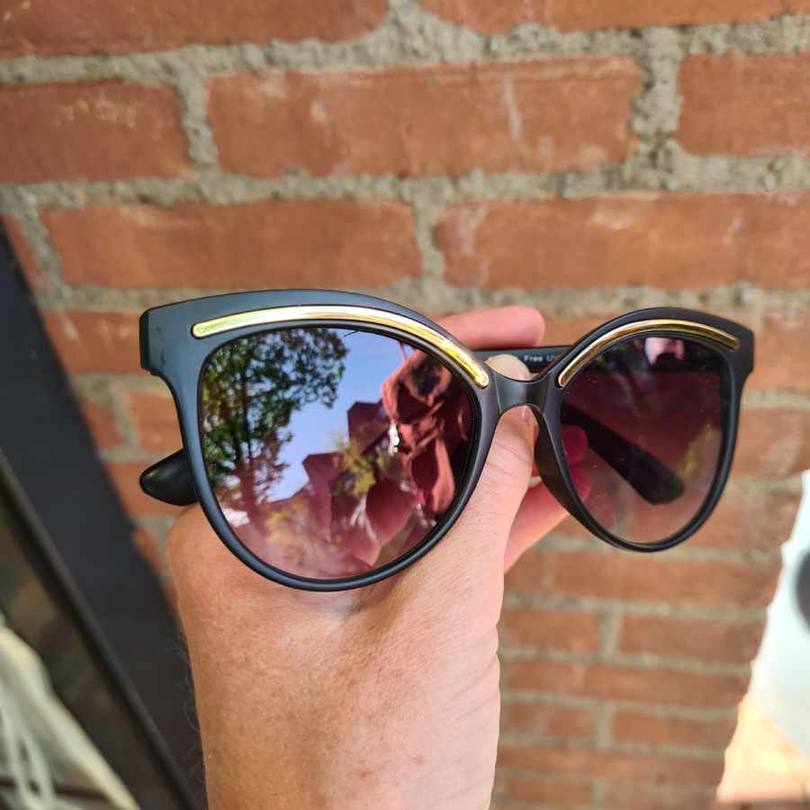 Zonnebril met zwart montuur en goudkleurige randen aan de bovenkant. Deze grote glazen bieden 100% UV bescherming, want ze beschermen je ogen tegen de schadelijke straling van de zon. Bij elke zonnebril krijg je een handig opberghoesje om je zonnebril langer mooi te houden.
