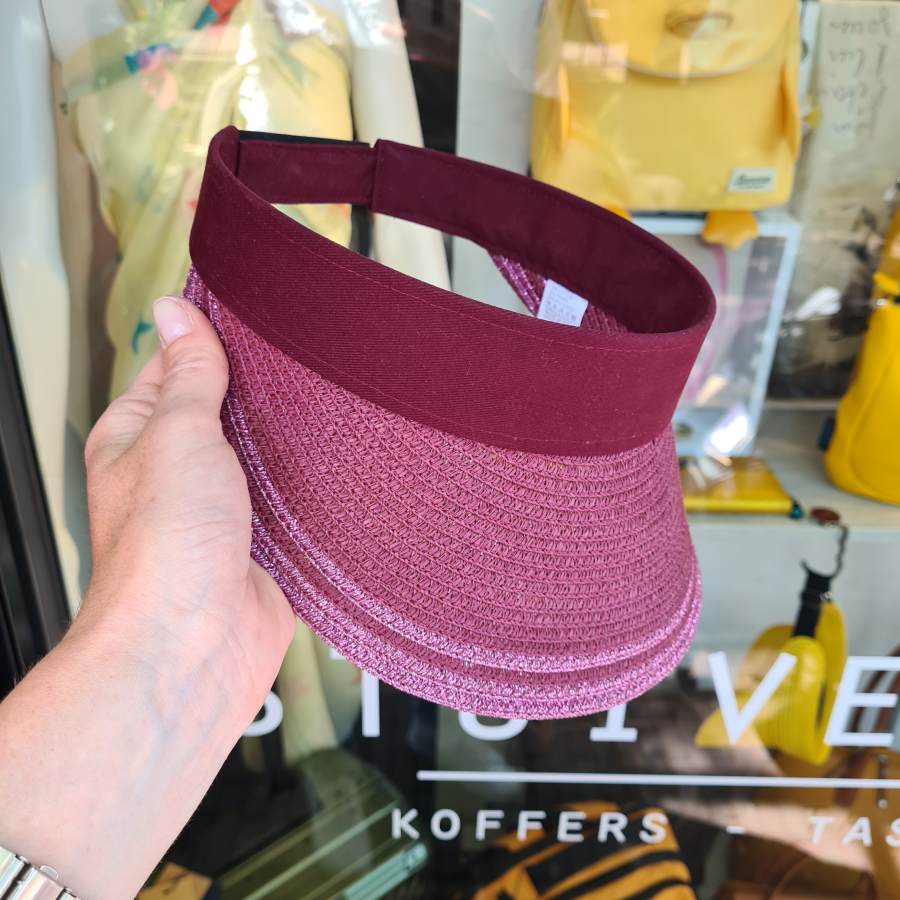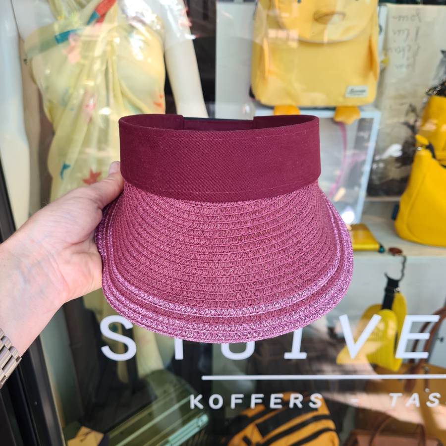 Paars / aubergine kleurige zonneklep met subtiele metallic rand en achterkant van klittenband (past altijd!)