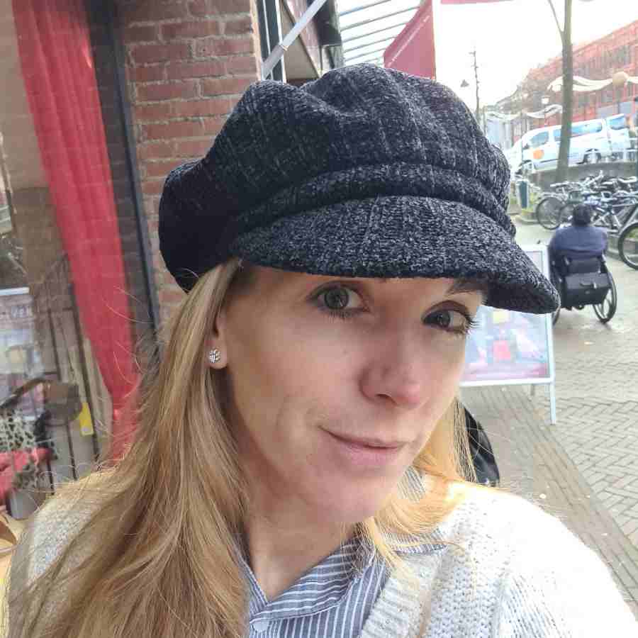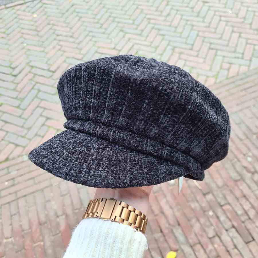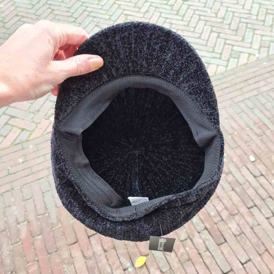 Petje zwart dames met stroken van polyester met leuke klep (past altijd!)
