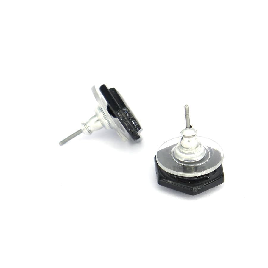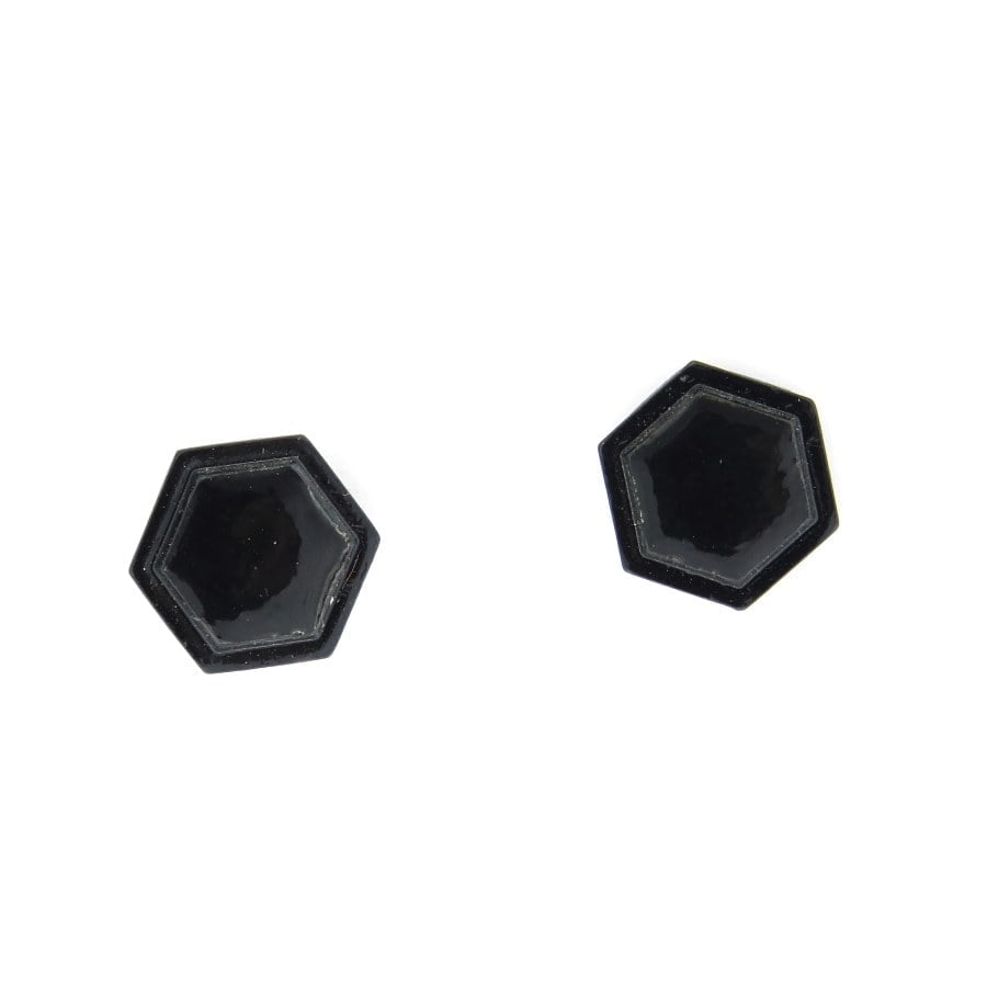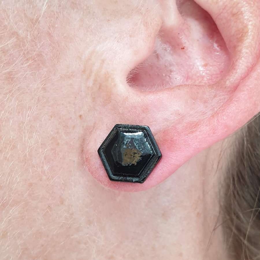 Leuke oorsteker in een zeshoek in zwart. De gehele oorbel is zwart, ook de achterkant. Deze oorsteker in zwart is 1.2 cm breed en valt mooi op het oor.